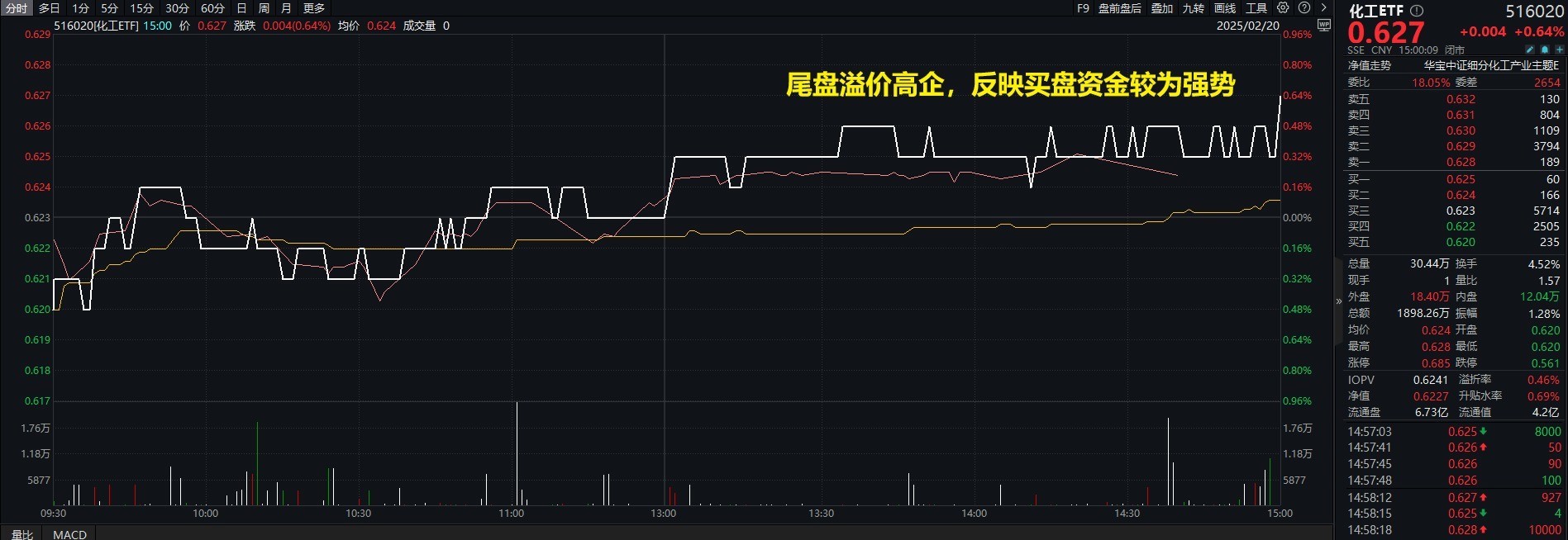 值得注意的是,尾盘化工ETF(516020)场内溢价持续走阔,收盘溢价率更是达到0.46%,反映买盘资金较为强势。